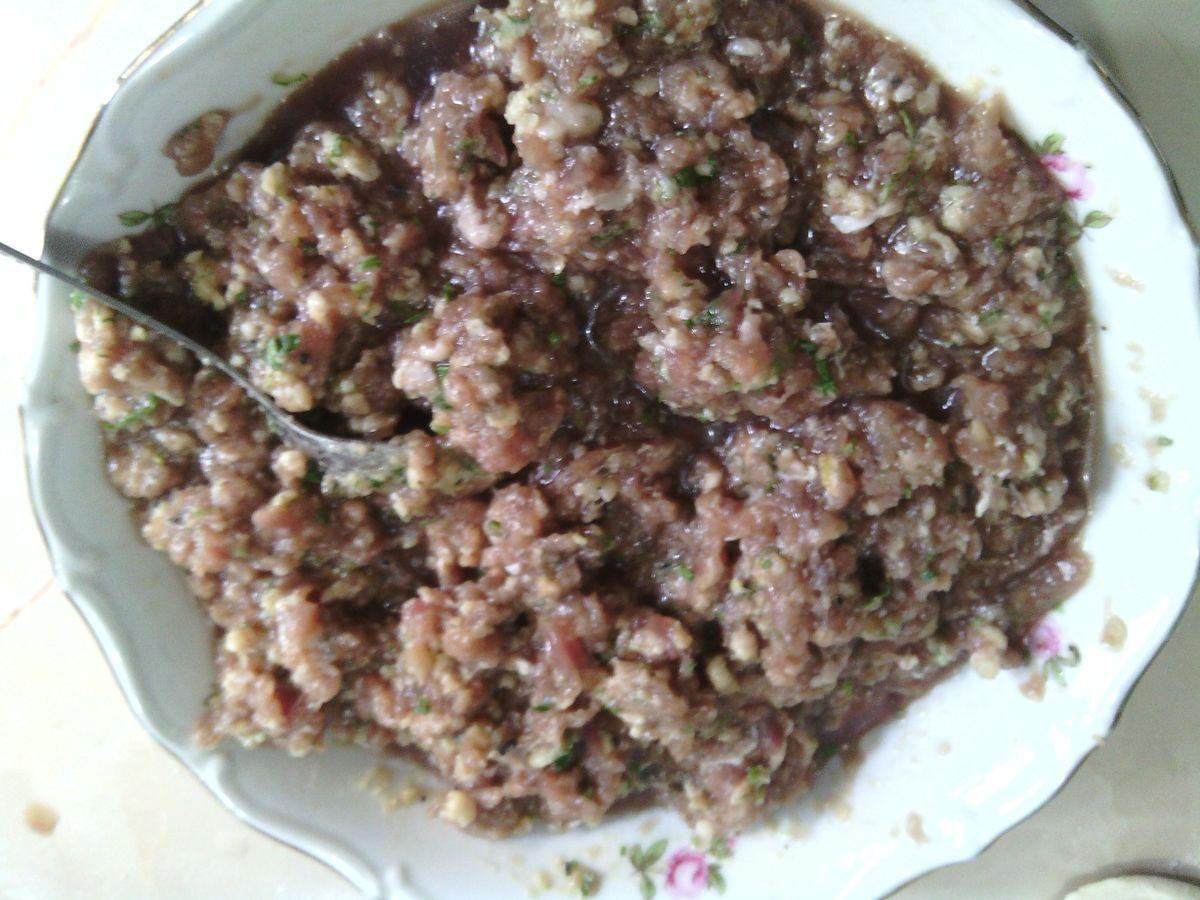 Превъртете месото с добавяне на зеленина, сол, черен пипер, разбъркайте добре. Добавете малко топла вода, така че плънката да не е гъста, но да има консистенцията на течна заквасена сметана.