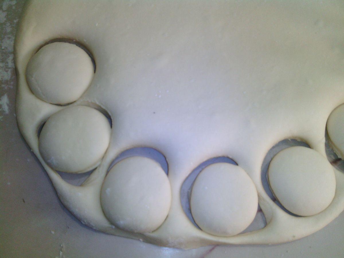 Сега отново към теста. Разточете слой с дебелина 2 см и изцедете чаша с кръгчета с диаметър 5 cm.