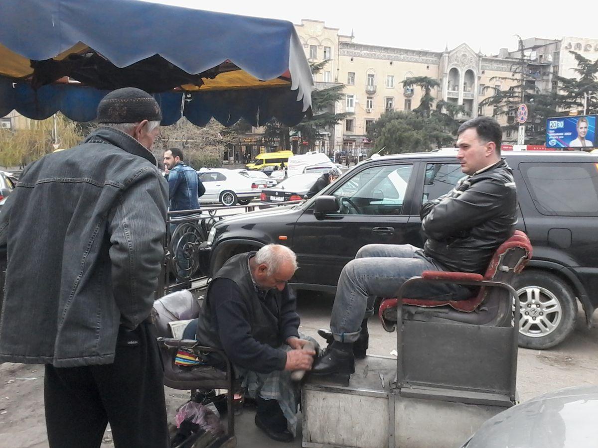 Но повече няма да дърпам - това е почистващо средство за обувки! И всичките му устройства: четки, куфар, буркани с крем - само поздрав от миналото. За грузинците присъствието му е често срещано явление и бях толкова изненадан, че не можах да устоя и се снимах. Къде виждате това сега?