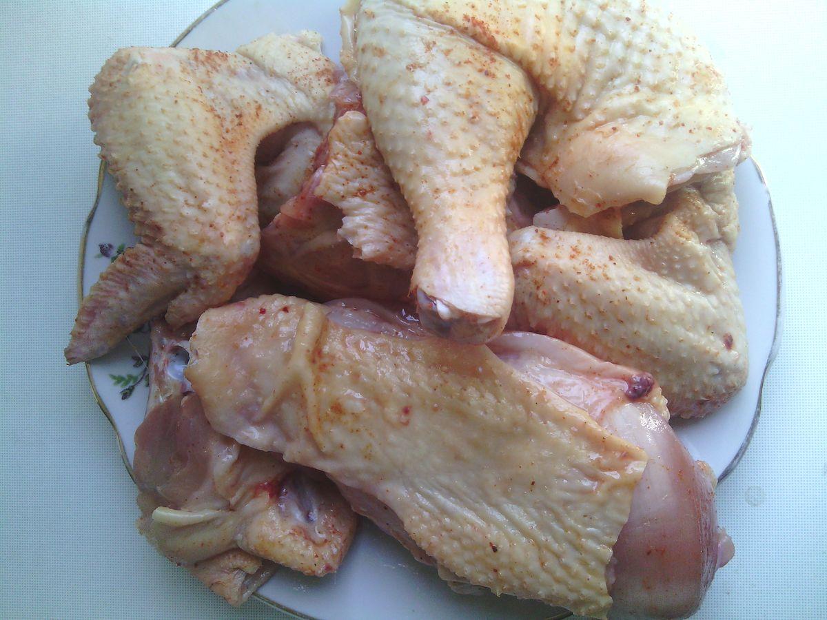 И пристъпете към готвене. Нарежете пилето на парчета, измийте, подсушете, сол и черен пипер. Запържете от всички страни до готовност.