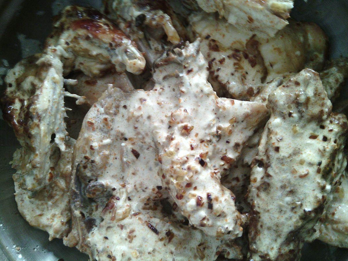 Потопете всяко парче пържено пиле в майонезен сос и сложете в купа.
