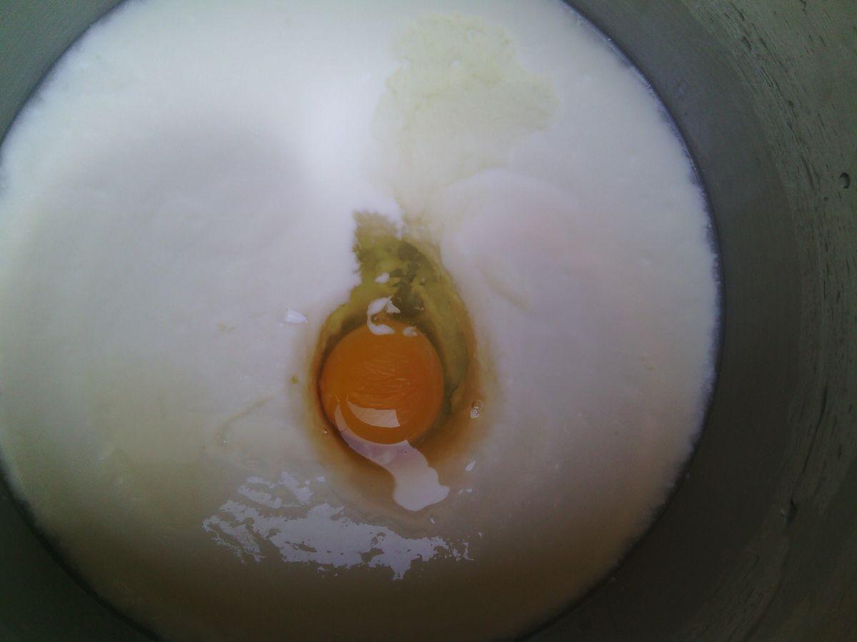 Изсипете кисело мляко или кефир в тиган, добавете вода и яйце.