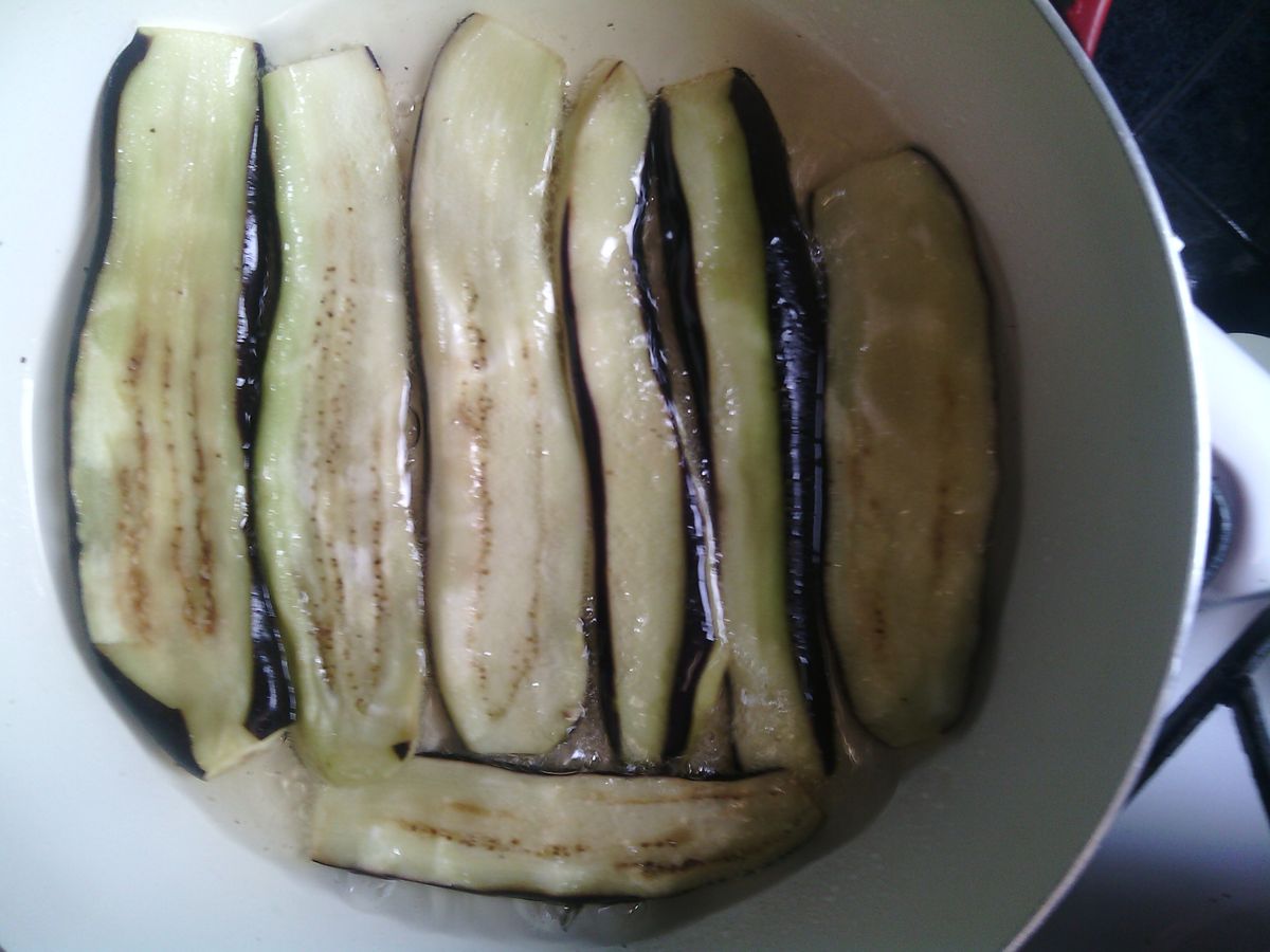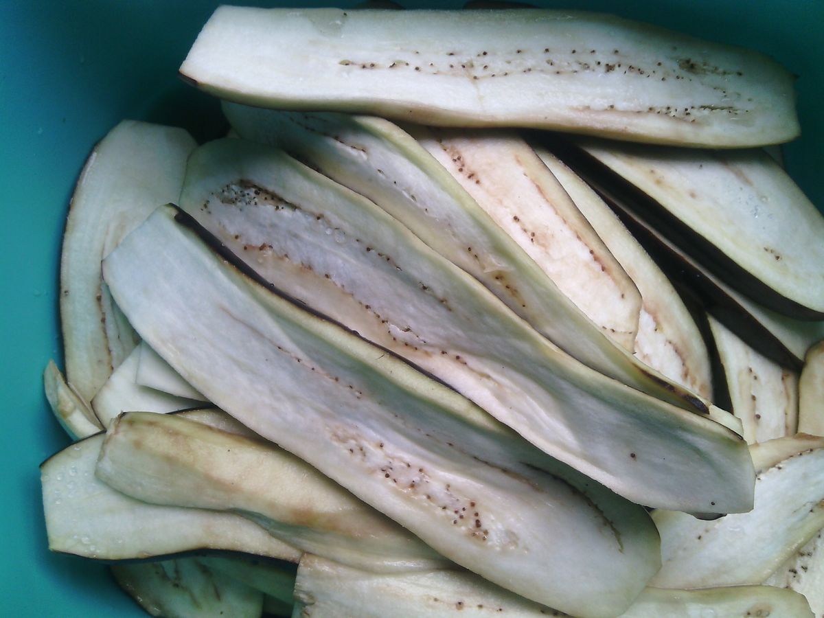 Ами какво? Започваме ли? Като начало патладжанът ми (може да бъде обелен), нарязан на дължини на ленти с дебелина 0,5 см. Посолява се и се оставя за час, така че да излезе цялата горчивина.