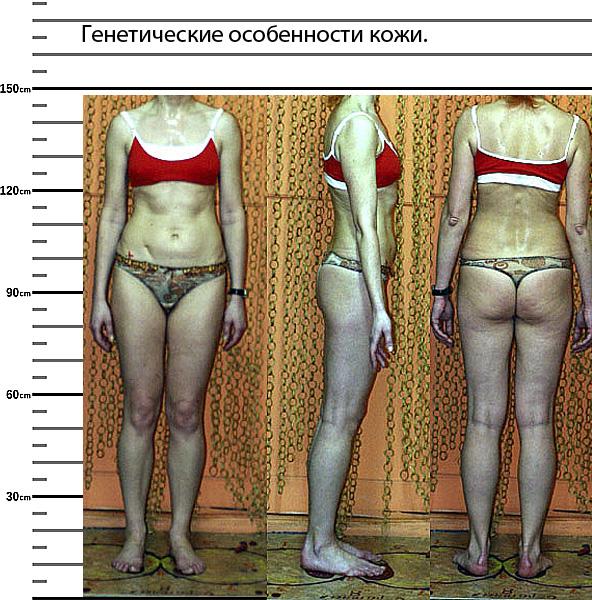 En otro caso, las mujeres con peso normal y una pequeña cantidad de grasa pueden tener piel en sus caderas que se asemeja a la superficie de la luna. Y los cosméticos anticelulíticos volverán a ser impotentes, aunque estas mujeres son activamente, pero, desafortunadamente, lo usan en vano. El síndrome se llama dismorfismo. La grasa se acumula exclusivamente en un lugar en las caderas, ignorando el estómago, los brazos y la cara en todos los sentidos.