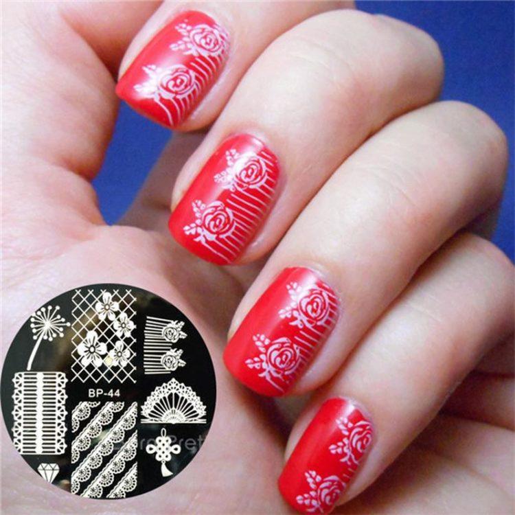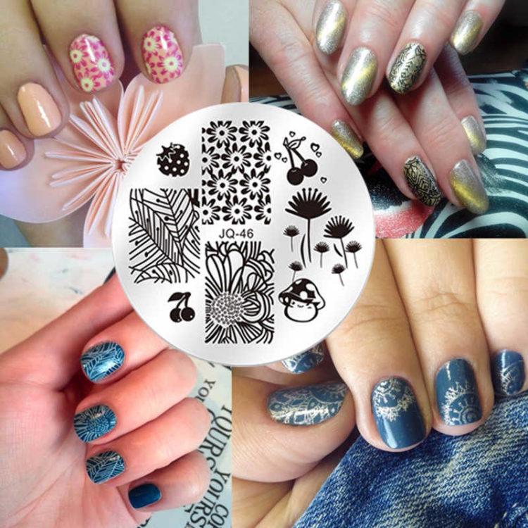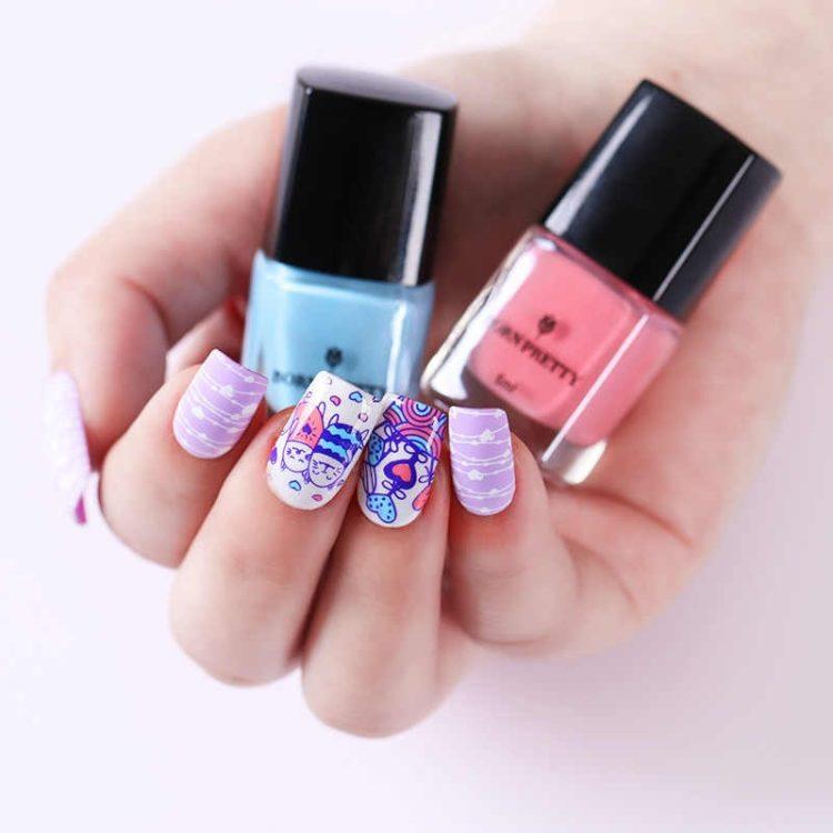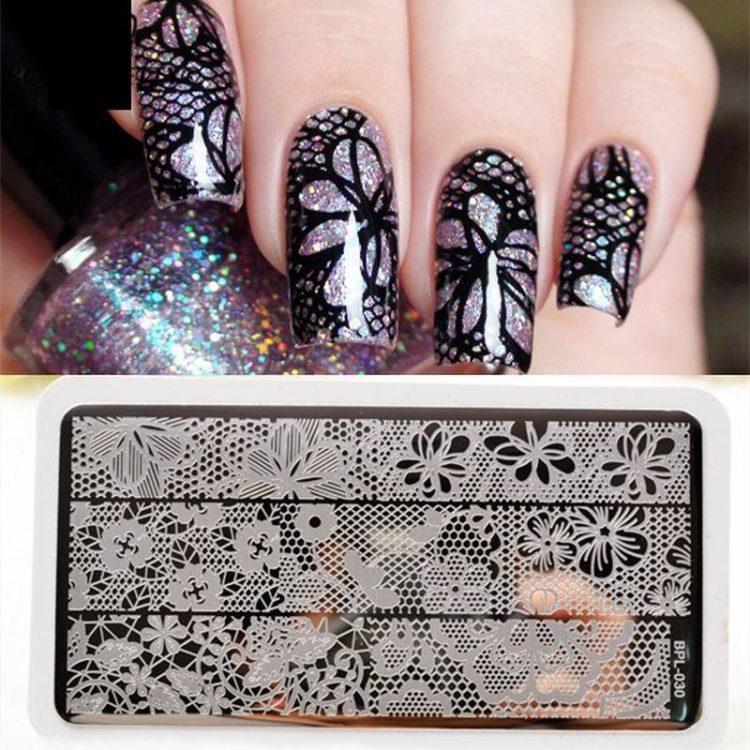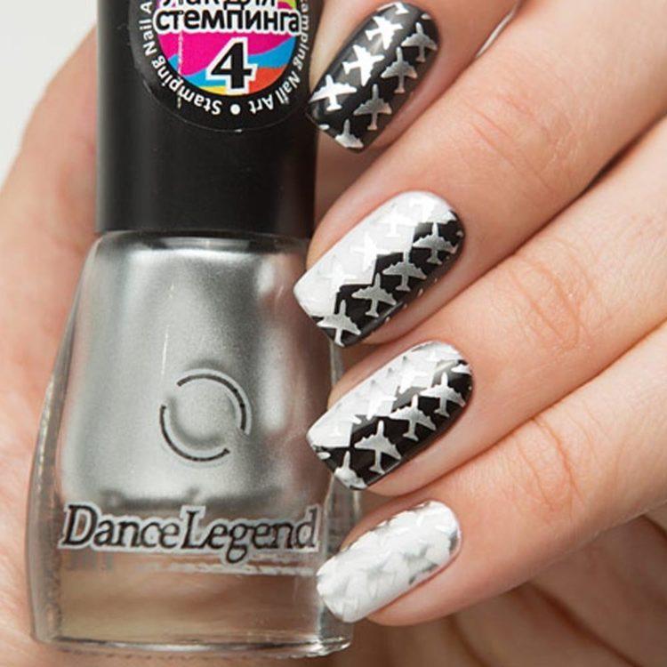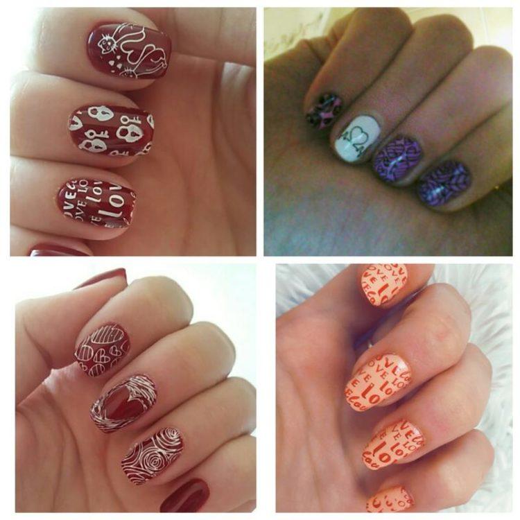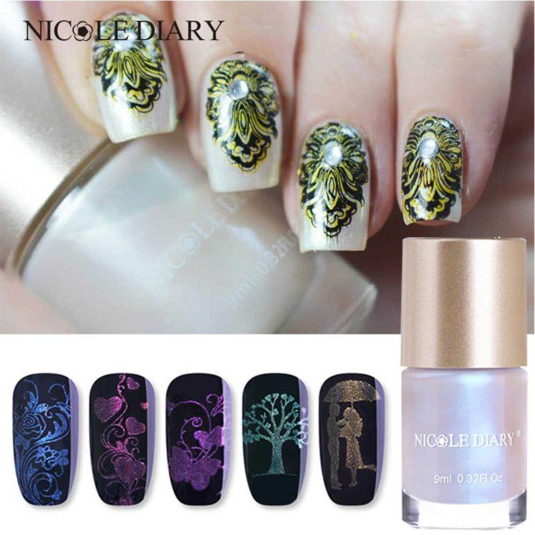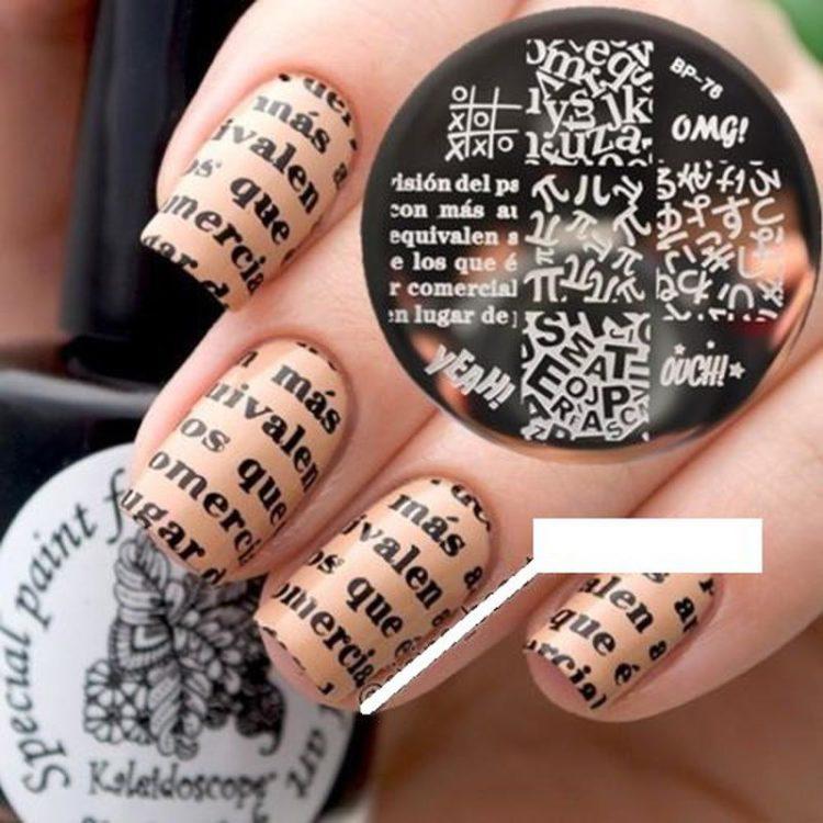 Para hacer un hermoso estampado o impresión en sus uñas, compre un kit de estampado. Se toman pintura o barniz de tres tipos diferentes en la base, el fondo principal, el revestimiento transparente superior. ¿Cómo usar un sello, sello o placas, cómo aplicar barniz de gel de estampado para hacer una hermosa manicura de estampado? Esto no es difícil: haga una manicura regular (debe secarse por completo), luego aplique una pequeña cantidad de esmalte de uñas saturado o gel con un sello de uñas, retire cuidadosamente el exceso con un raspador dibujándolo a lo largo del plano superior del sello. Presione el sello con el patrón en la placa de la uña. Para arreglarlo, cubra el estampado de manicura con barniz transparente. Tanto el sello de estampación como la pintura de estampación deben ser de alta calidad.