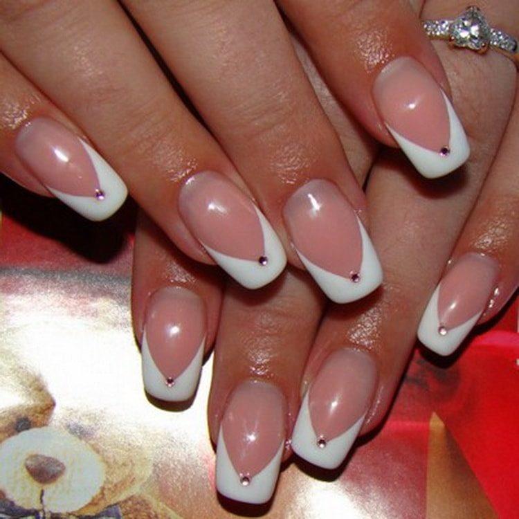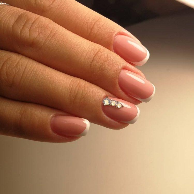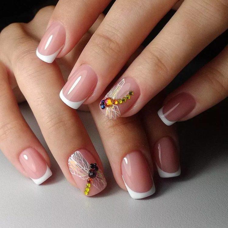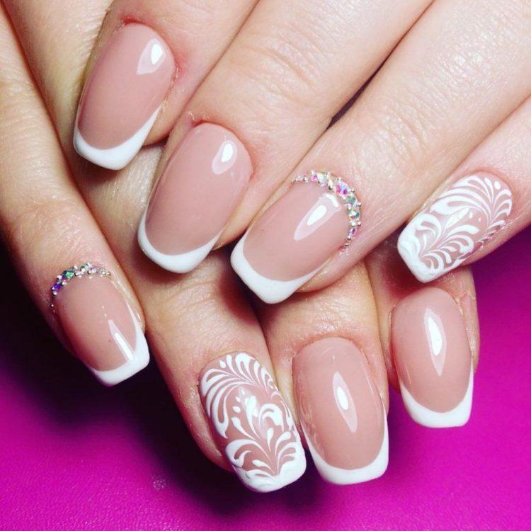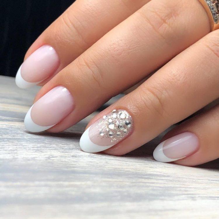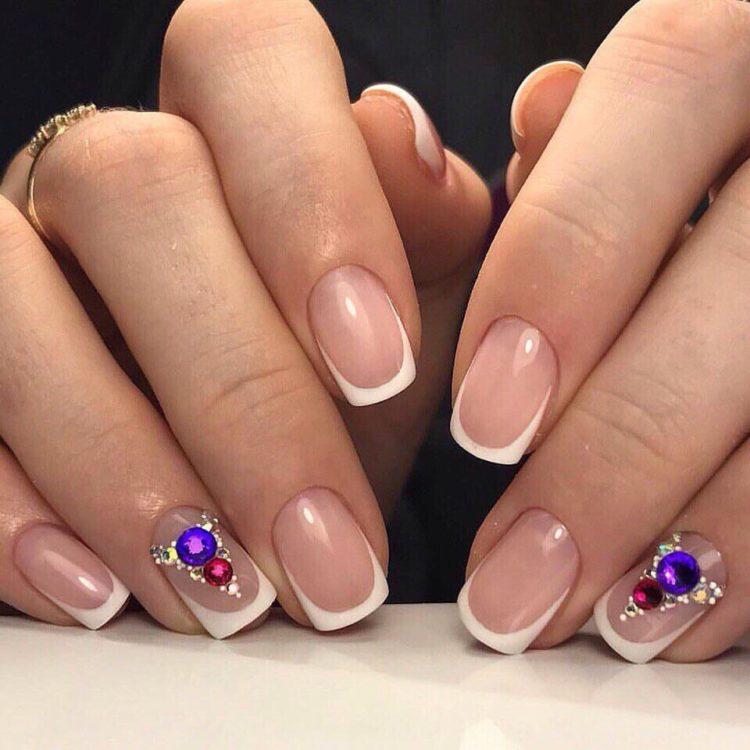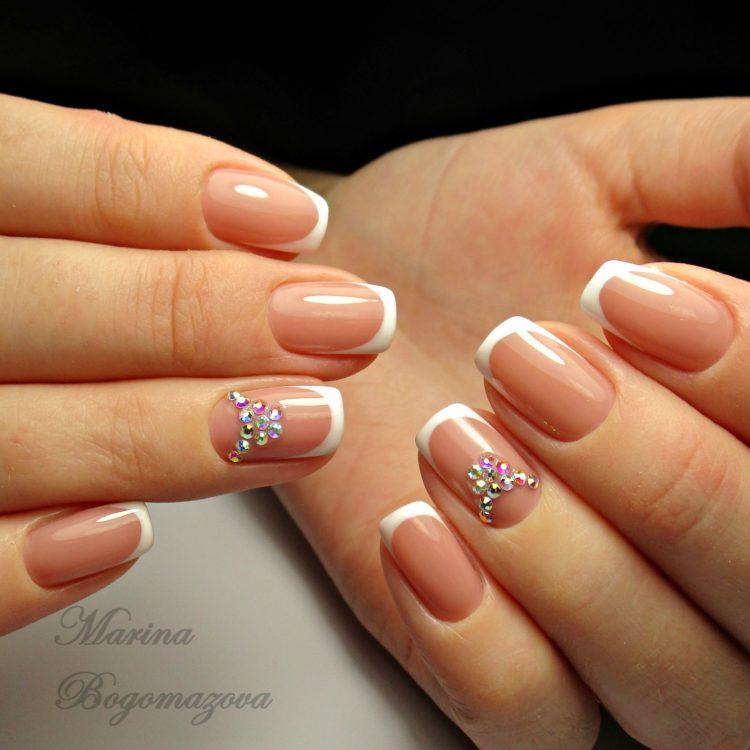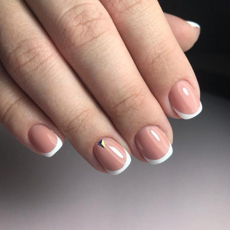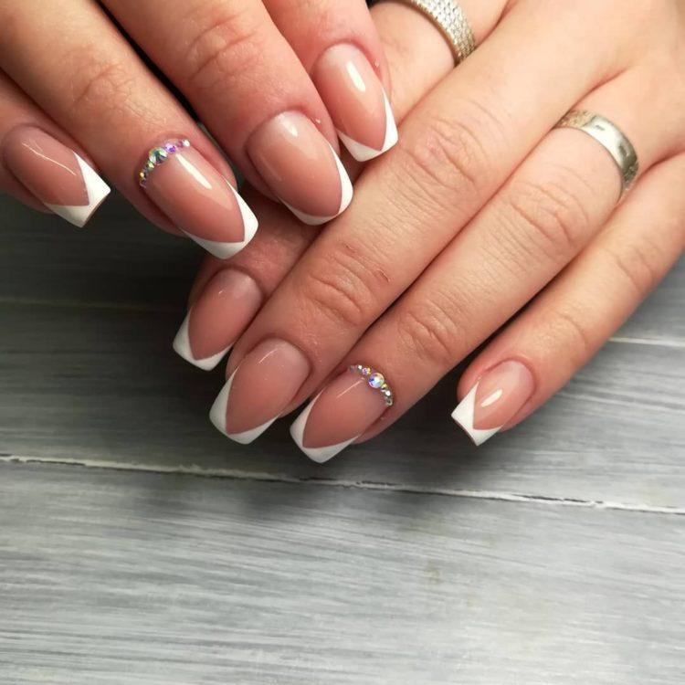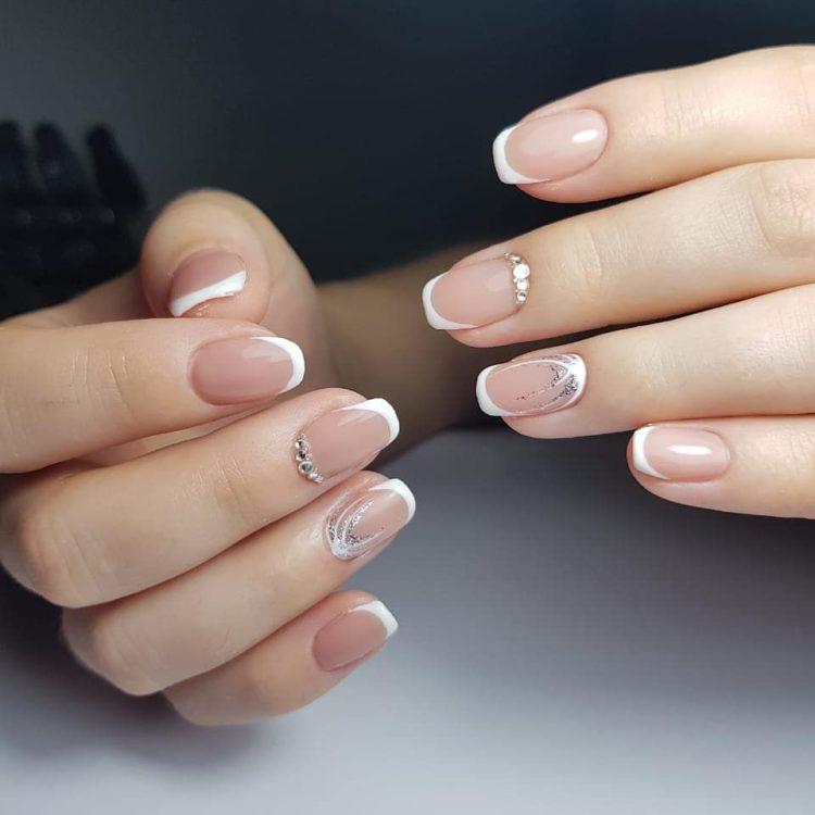 Моден френски бял маникюр е идеален за млади дами. Разглеждайки актуалните тенденции, обърнете внимание на бялото яке с горни камъни, както и на белия френски дизайн на ноктите, който предполага разтриване. Те са гарантирани да освежат вашия външен вид.