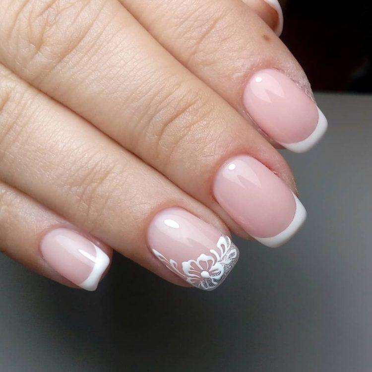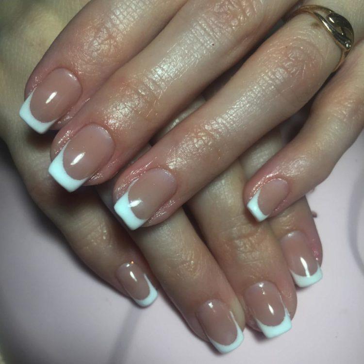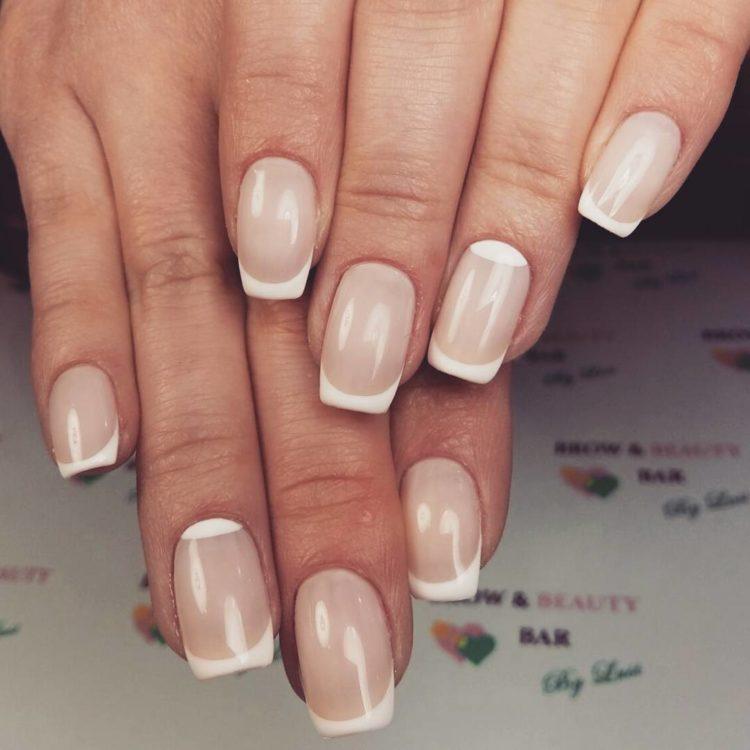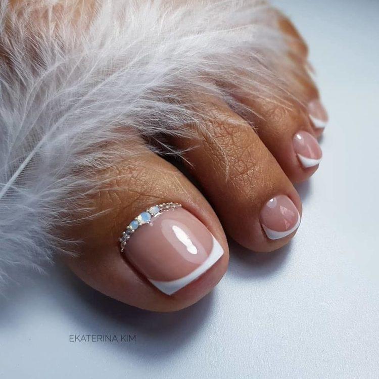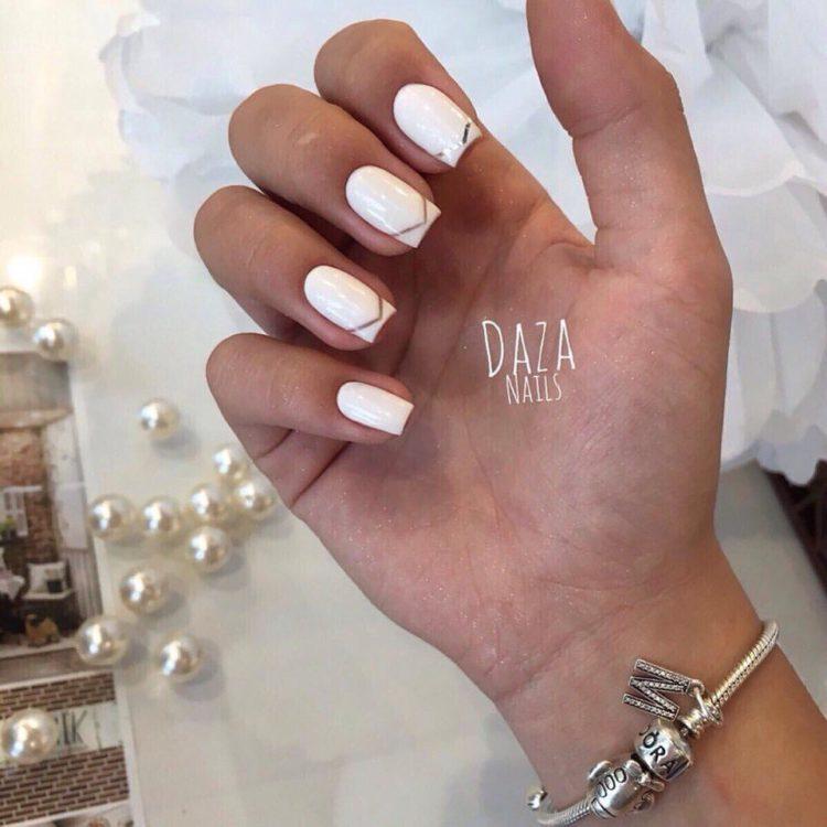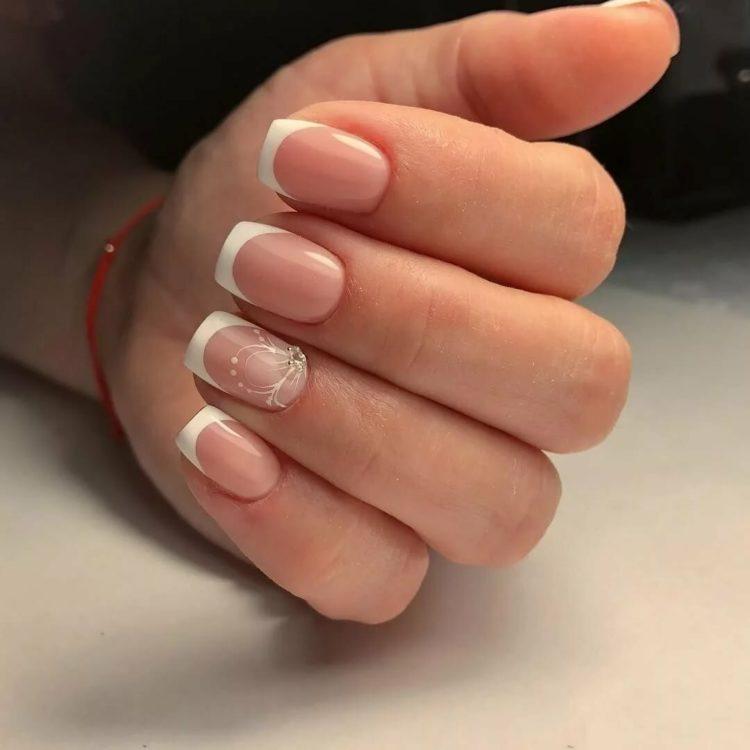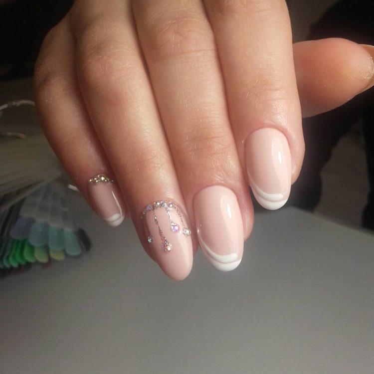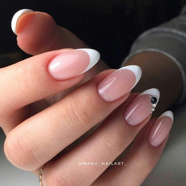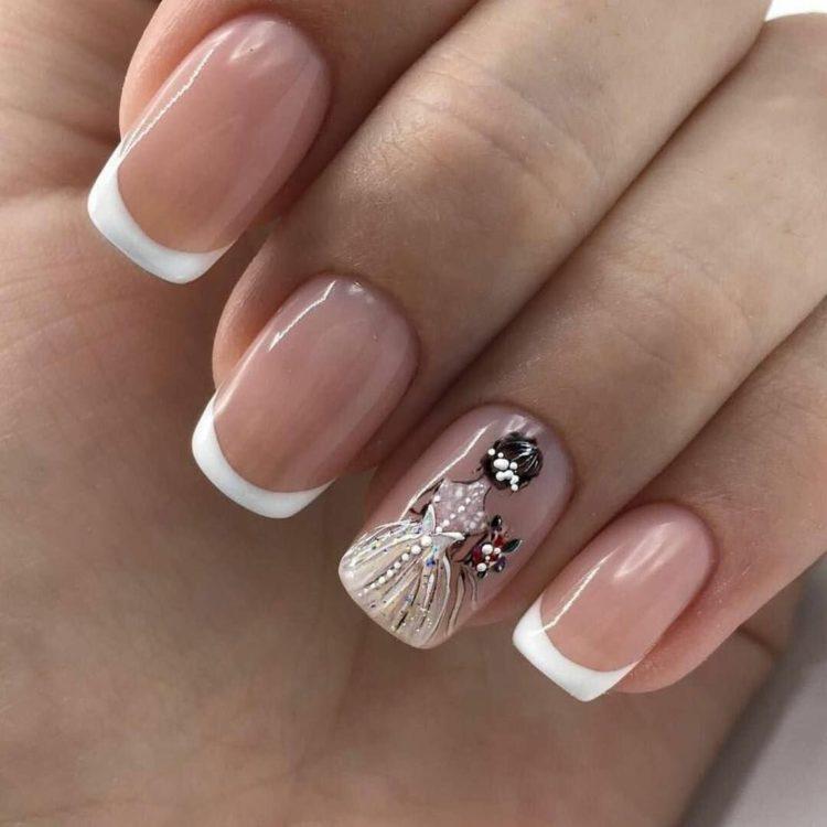 Моден френски бял маникюр е идеален за млади дами. Разглеждайки актуалните тенденции, обърнете внимание на бялото яке с горни камъни, както и на белия френски дизайн на ноктите, който предполага разтриване. Те са гарантирани да освежат вашия външен вид.