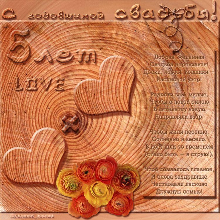 След пет години брак съпруг и съпруга празнуват годишнина, която се нарича дървена сватба. Това е първата годишнина от брака заедно, първата годишнина, която трябва да се чества. Символът на тази годишнина е дърво, което е не само траен материал, но и знак за живот, дълголетие. Празнуването на дървена сватба е отличен повод да направим равносметка на петгодишния живот заедно.