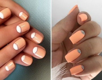 Модните нокти в бежови нюанси са в тенденция. Стилистите предлагат дизайн с прасковен гел лак като основен (матов фон) и като декор. Оранжевият и прасковен цвят маникюр в дизайна перфектно се съчетава с черно и бяло, всички нюанси на сивото, с палитра в пастелни цветове. Ноктите с цвят на праскова са много ефективни във френски стил. Всеки деликатен гел или лак, нежно прасковен цвят, по-наситен кайсия, ще се справи за него. Маникюр с цвят на праскова може да се направи закачлив, като се подчертае ръба на нокътя с тъмен цвят (например шоколад) и се декорира с модел в същия цвят.