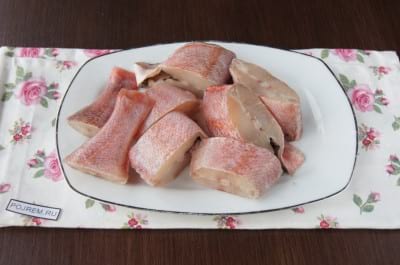 - размразете рибата (или използвайте прясна), измийте добре (особено вътре) и оставете излишната течност да се отцеди, след което я нарежете на парчета с ширина 1,5 до 2 сантиметра;