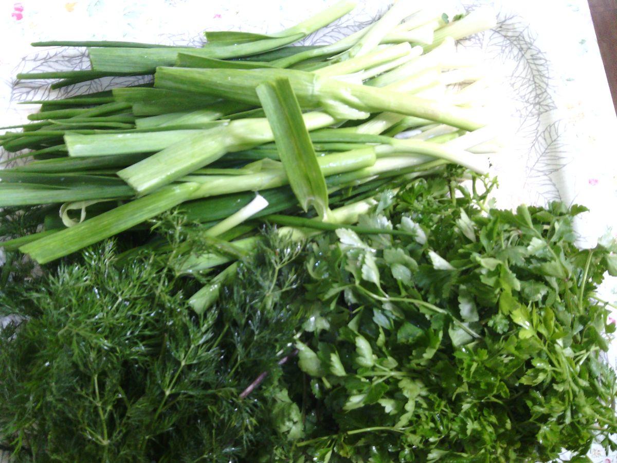 - verdeață: 300 g pătrunjel, 200 g cilantro, 300 g mărar, 3 buchete de ceapă verde, 3-4 tulpini de usturoi verde tânăr, 10-12 buchete de tarhon;