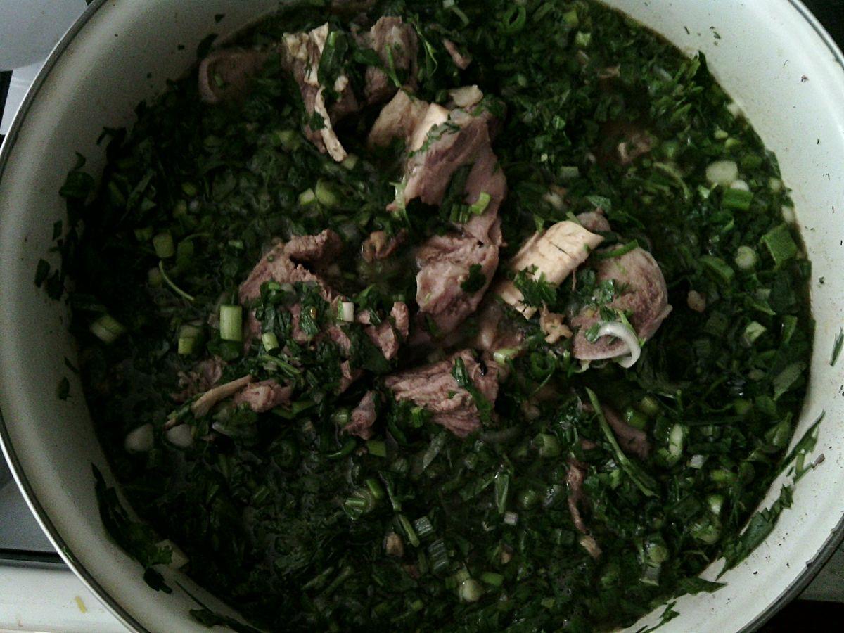 Când carnea este gătită, turnați toate verdeața și ceapa prăjită în tigaie.
