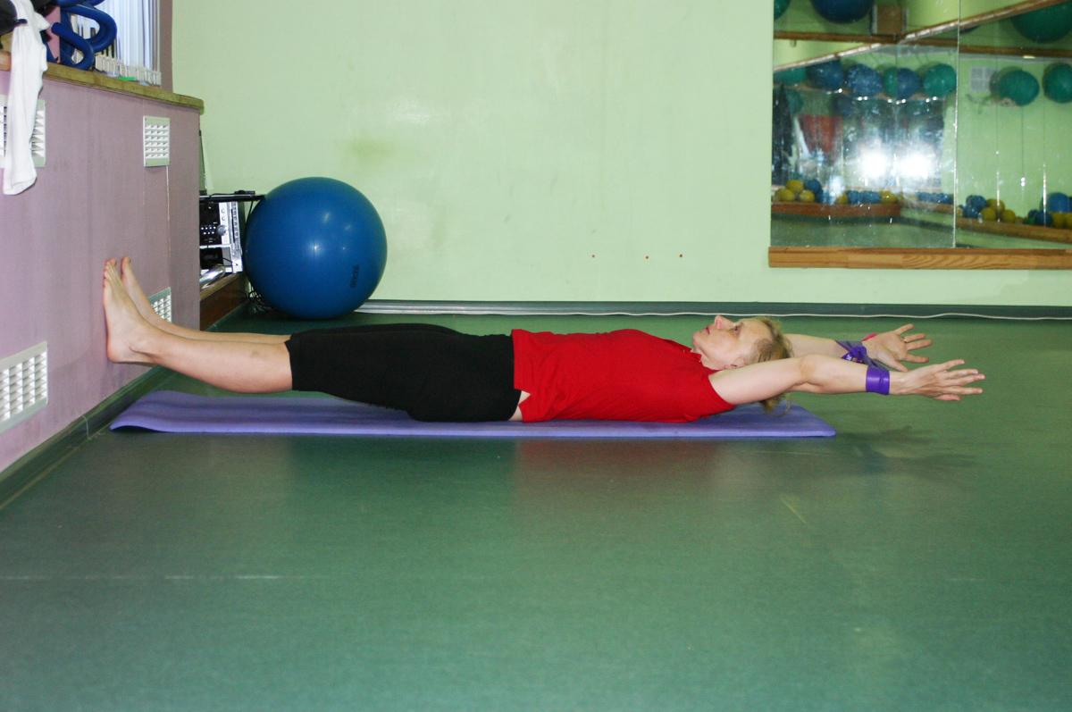 Întinde-te pe stomac. Pe mâini este un amortizor de cauciuc legat într-un inel. În timp ce expirați, apăsați simultan cu picioarele în perete la o înălțime de 10-20 cm și ridicați mâinile deasupra podelei la aceeași înălțime, întinzând ușor cauciucul. Mențineți poziția timp de 5 secunde.