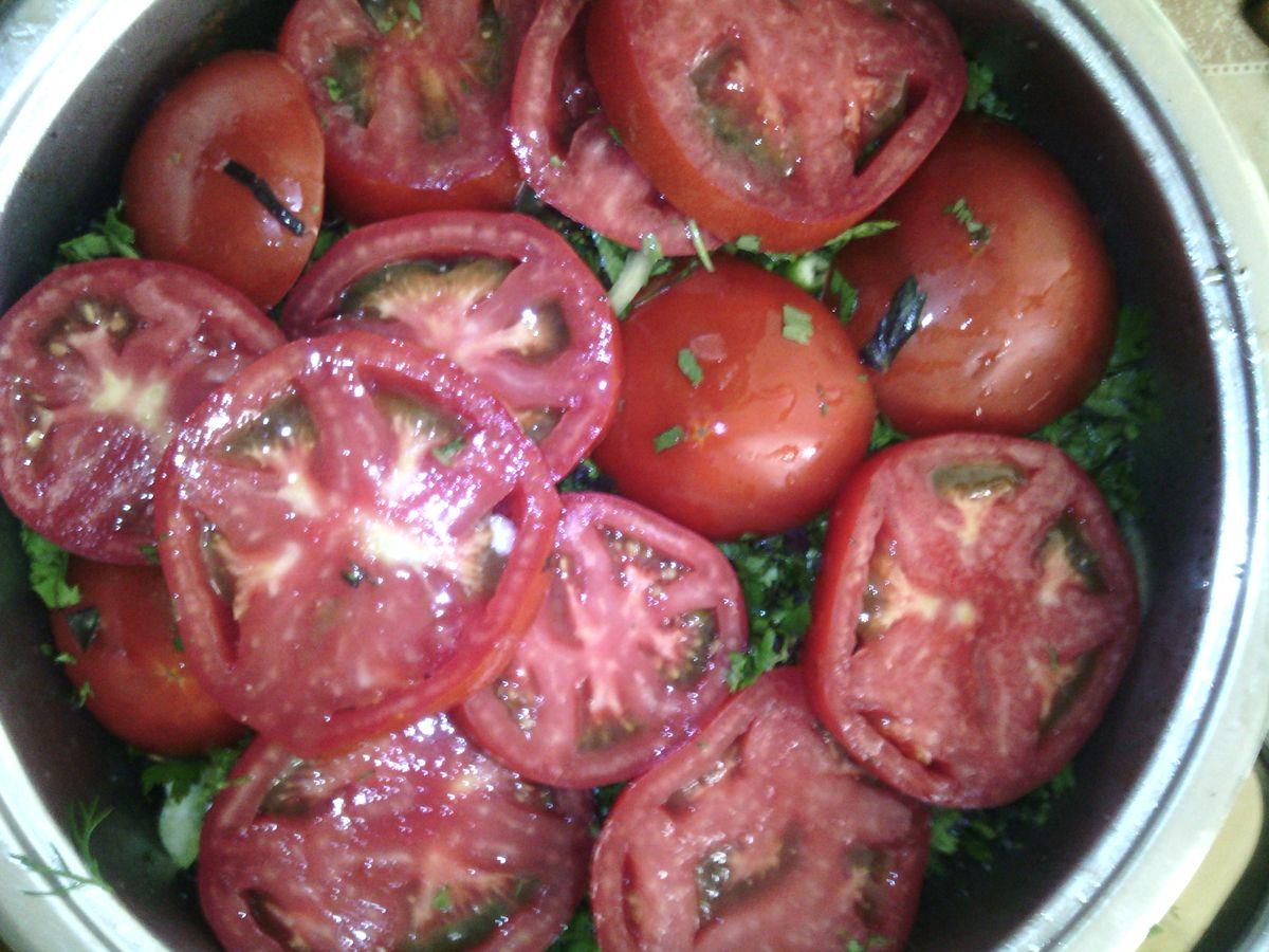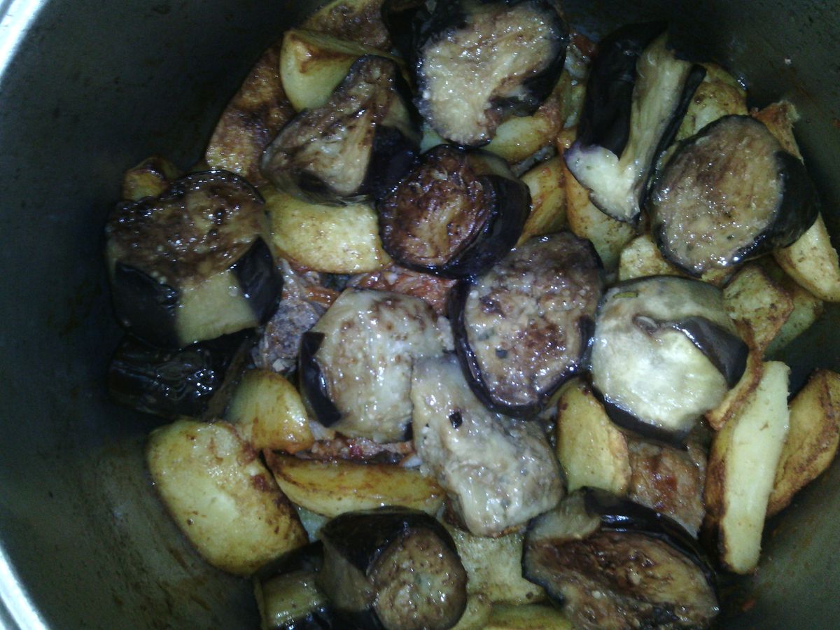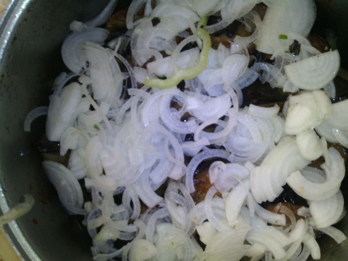 Puneți cartofii deasupra. Apoi vinetele prajite, apoi ceapa tocata, ardeiul gras si rosiile feliate. Se condimentează cu sare.