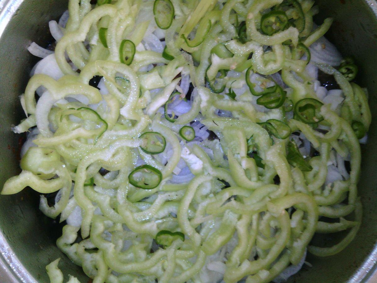 Taiem totul, ardeiul si ceapa in fasii.